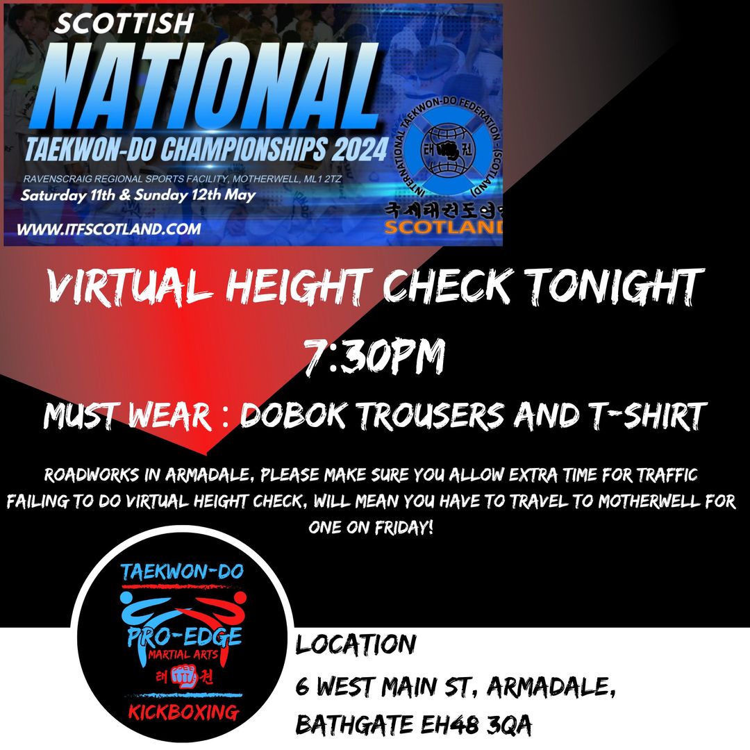 Virtual height check tonight 7:30pm for Scottish National Taekwondo Championships – MUST WEAR – Dobok Trousers and T-Shirt : Roadworks in Armadale, please make sure you allow extra time for traffic, failing to do virtual height check, will mean you have to travel to motherwell for one on friday!